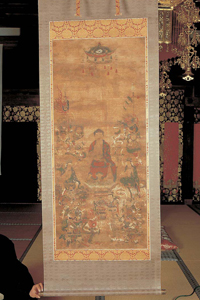 蜂屋・瑞林寺に伝わる十六善神図です。室町時代の作と推定されます。十六善神図とは大般若経とその護持者を守護する善神を描くものです。本図は釈迦を中央に、左右に文殊、普賢菩薩および法涌(ほうゆう)、常蹄(じょうてい)菩薩を置き、下方に深沙大将(じんじゃだいしょう)と玄奘三蔵、その周りを十六善神が囲むような形で表されます。作品は、破損が目立ち折れ目が多いですが、筆法や筆力、著色からは技法が熟達していることがわかります。