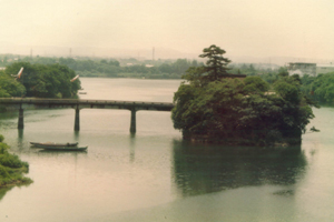 下米田小山地先、飛騨川の中の島にある堂宇を含む景観が景勝地として美濃加茂市の指定名勝となっています。もとは陸続きでしたが、昭和14(1939)年の今渡発電所の建設によって水位が上がり、現在は橋で行き来をするようになっています。本尊の馬頭観音は7年目ごとに開帳となる秘仏で、この像は下米田町山本に供養塔がある若名御前(木曽義仲※の母)の守り本尊であったともいわれています。 子授けの観音として名高く、また養蚕の神として人々の崇敬を集めています。旧暦の2月の初午には祭礼があり、例年大きな賑わいを見せます。