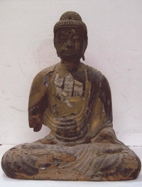 瑞林寺に残る漆箔(しっぱく・漆を塗った上に金箔を押すこと)、一木造(いちぼくづくり)の像です。衲衣(のうえ・僧が着る法衣)を着けて結跏趺坐(けっかふざ・両足を組んだ座り方)しています。市内では最古級である12世紀頃の仏像と推定されます。両腕が失われており、印相が不明なことが惜しまれますが、非常に優美な像で、腹と右足裏にかかる衣は流れるように美しく彫り出されています。 小像ではありますが、伏し目がちの眼や突き出し気味の顎、薄い胸、整った流麗な衣文に、定朝様式※の遺風がうかがえ、一方で顔はやや面長で丸みが少なく、鎌倉彫刻への接近が感じられることが指摘できます。様式的な過渡期における像として重要な像です。