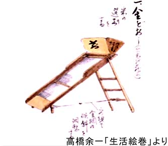 米の選別をする道具。 「センゴクドオシ(千石通)」「マンゴクドオシ(万石通)」などともいう。 フルイの網を斜めにして、上部の受け入れ口より穀物を流し、玄米とくず米とを選別する。 ヒモで金網の傾斜を調整することができる。 |