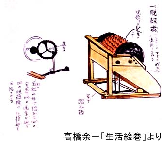 穂から米・麦・豆などを取る農具。 脱穀部はドラム部分に何本もの針金を山型に取り付けてあり、足踏み板を踏むとその脱穀部が回転する。 回転したドラムに、稲などを押しつけて穀物を収穫する。 実やゴミが飛び散らないようにホロをかぶせたものもある。 |